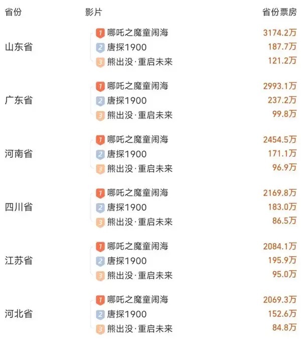 2月13日晚,据网络平台数据,电影《哪吒之魔童闹海》(《哪吒2》)票房(含预售)突破100亿元,成为中国影史首部百亿影片。在这场票房狂欢中,山东凭借强大的文化消费潜力,连续五天稳居全国票房贡献量前三,2月12日更是一举登顶。